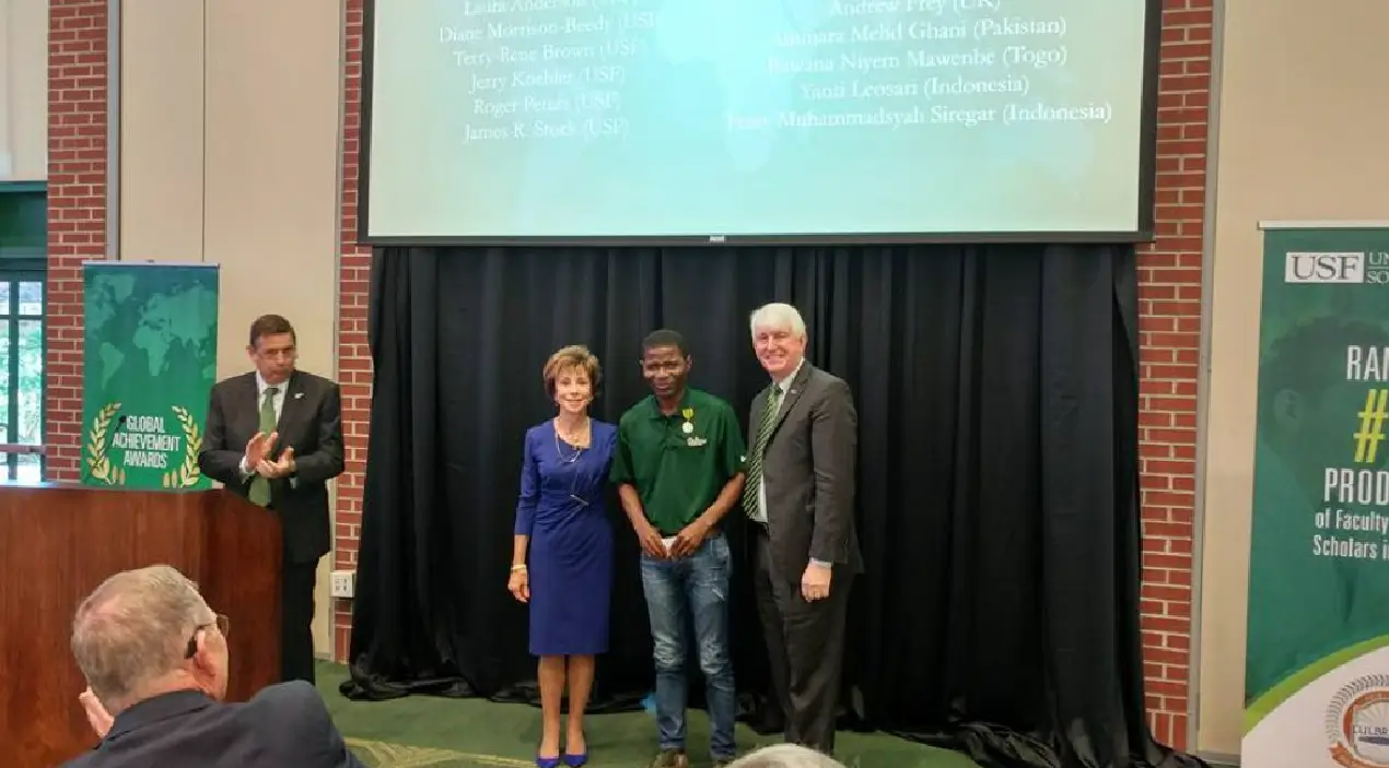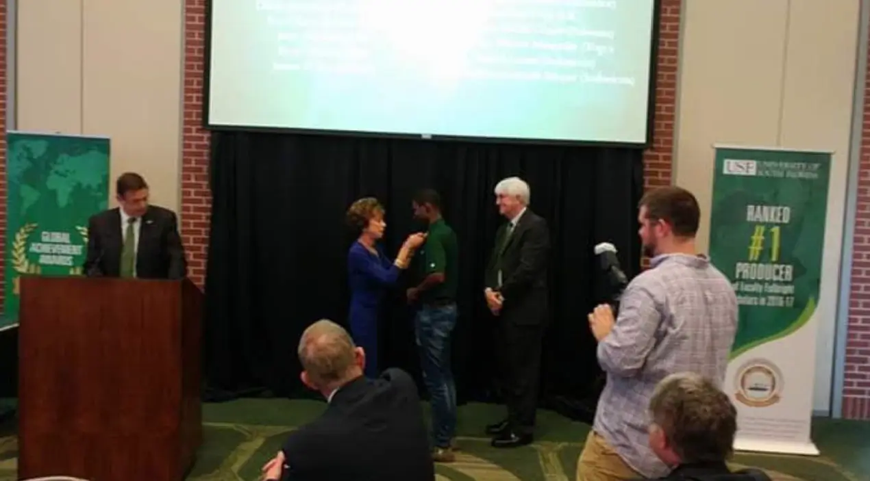 Global Achievement Award Ceremony – Niyem Bawana receiving the Global Achievement Award from Dr. Judy Genshaft, 6th President of the University of South Florida.