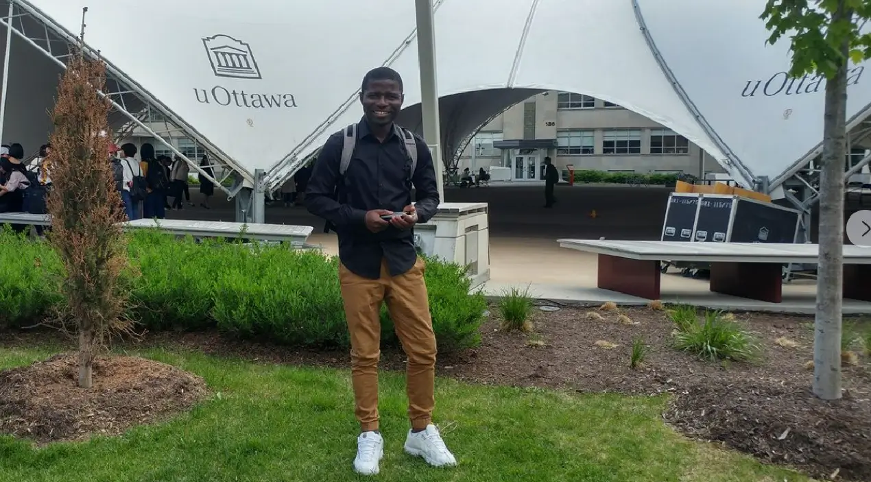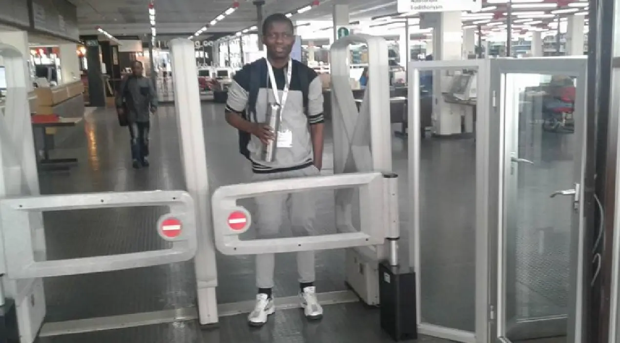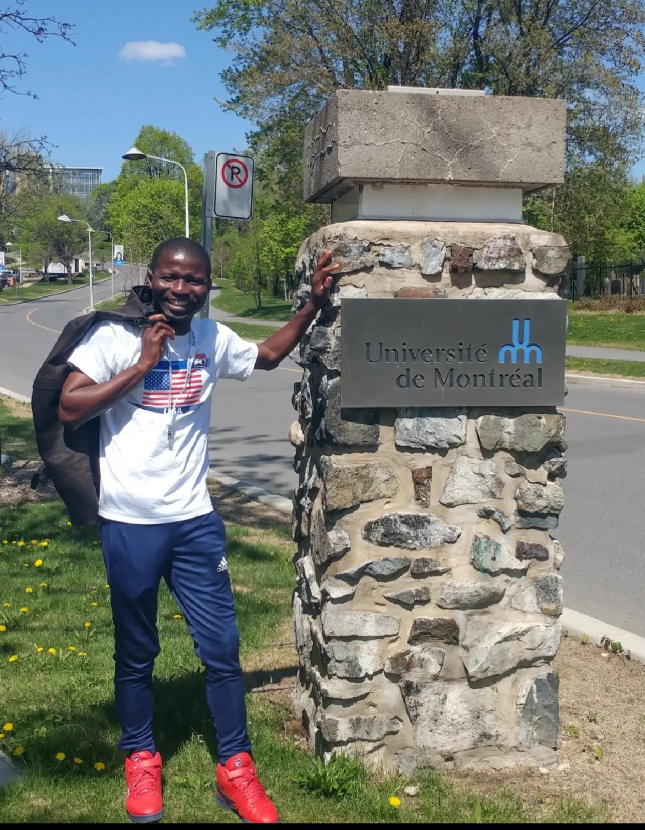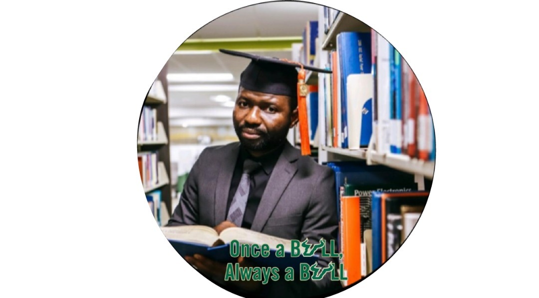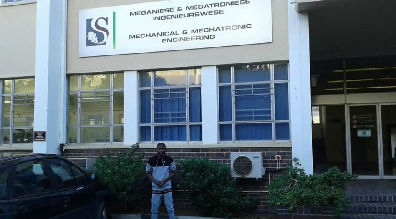 Niyem Bawana at Stellenbosch University in South Africa, 2015– in front of the Department of Mechanical and Mechatronic Engineering (left), and at the university library entrance (right).