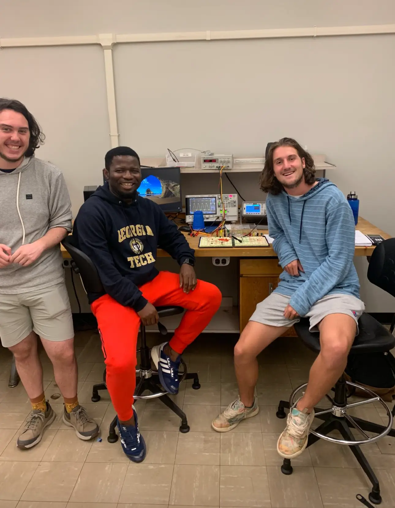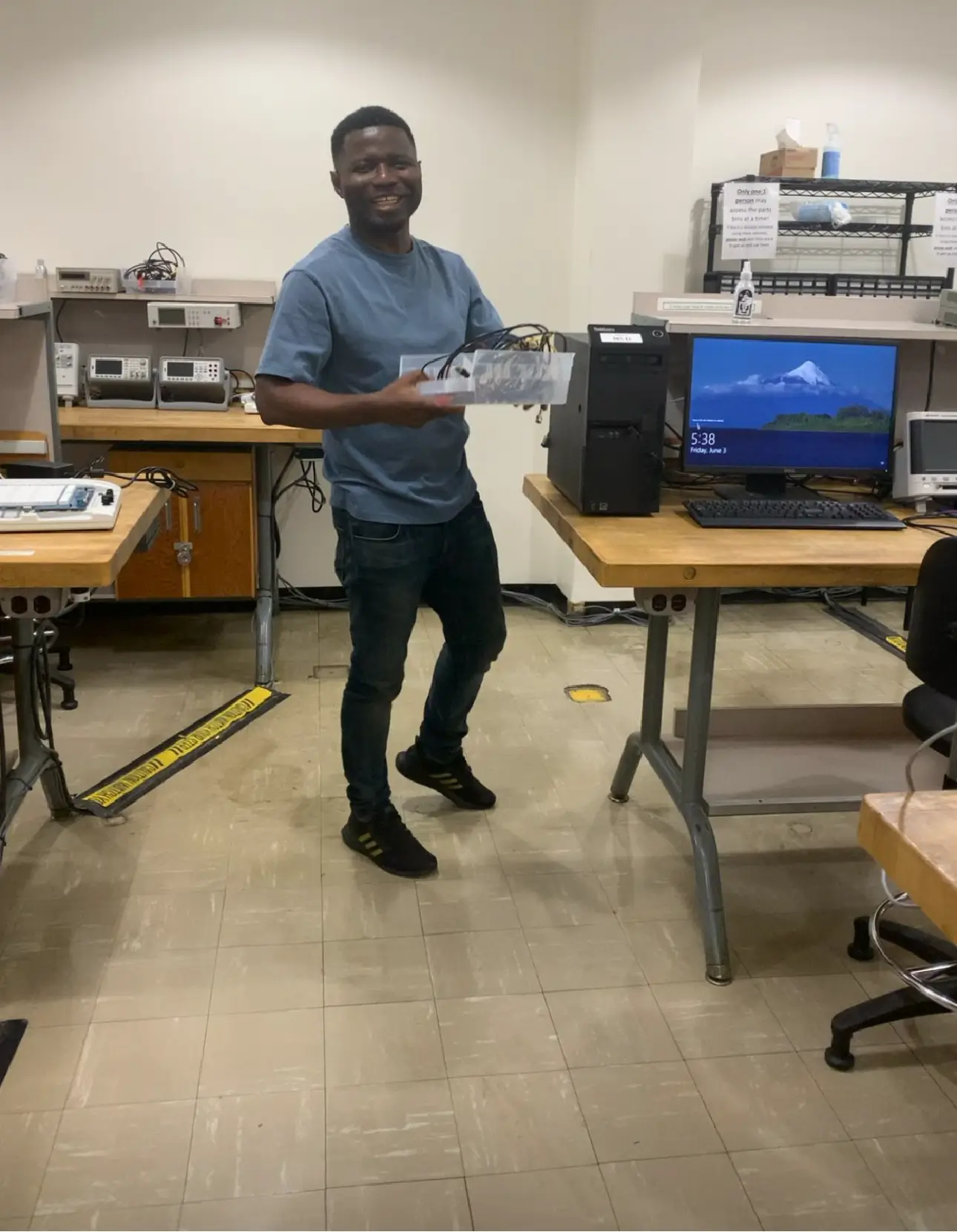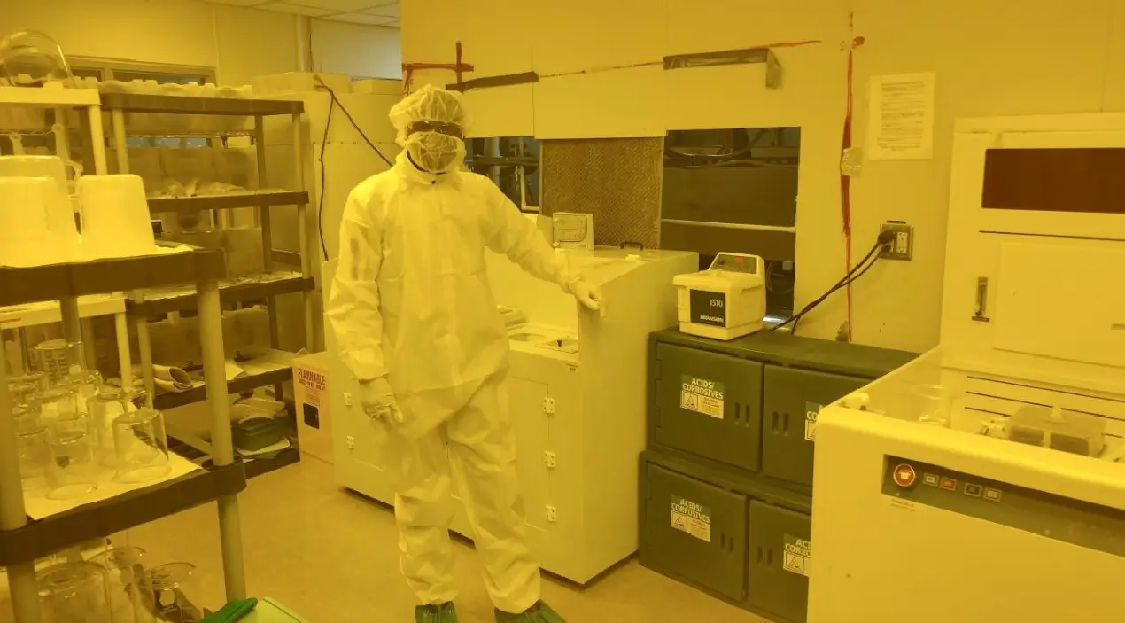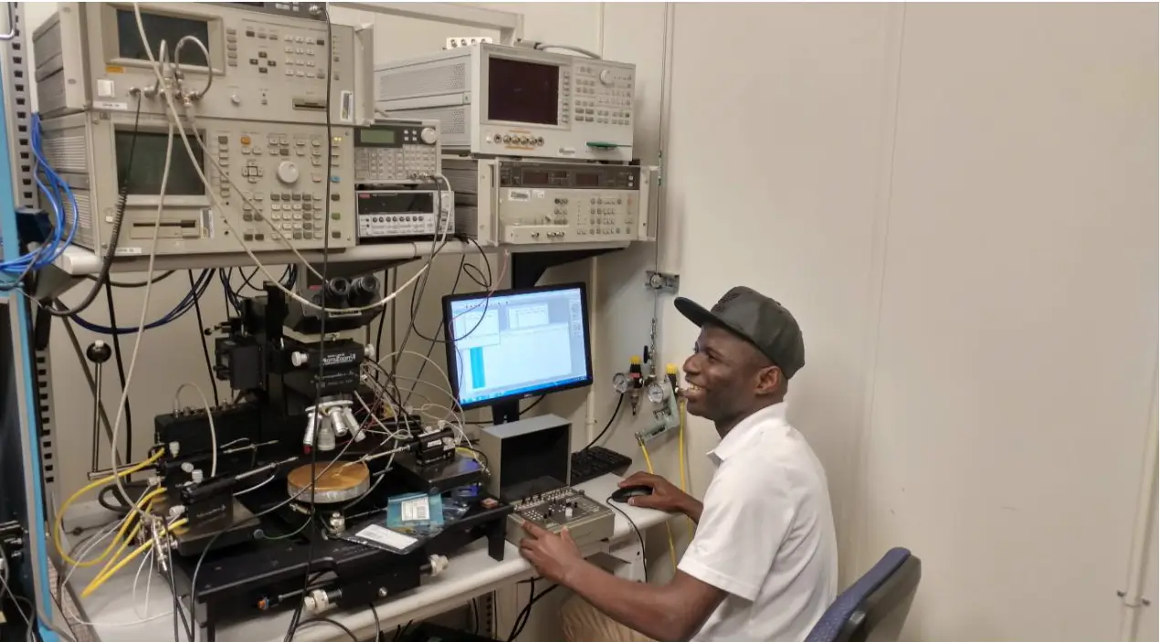 Niyem Bawana working in the Clean Room Lab at USF Tampa – fabricating an integrated circuit (left), and performing device characterization post-fabrication (right).