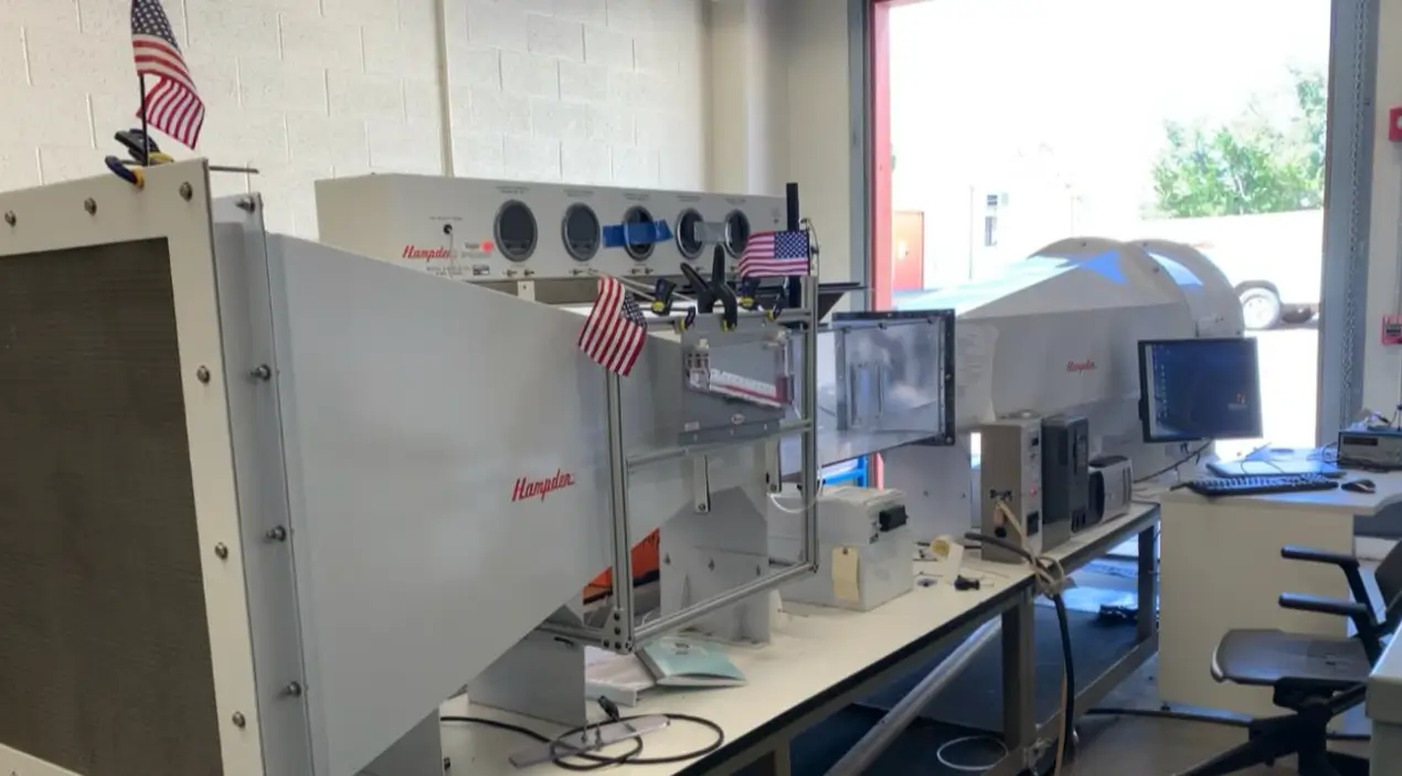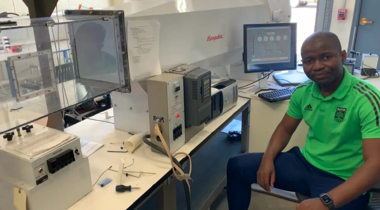 Niyem Bawana conducting wind tunnel testing in the Fluid and Thermal Systems Laboratory at New Mexico Tech – Department of Mechanical Engineering, Socorro. Photo taken while serving as a teaching assistant.